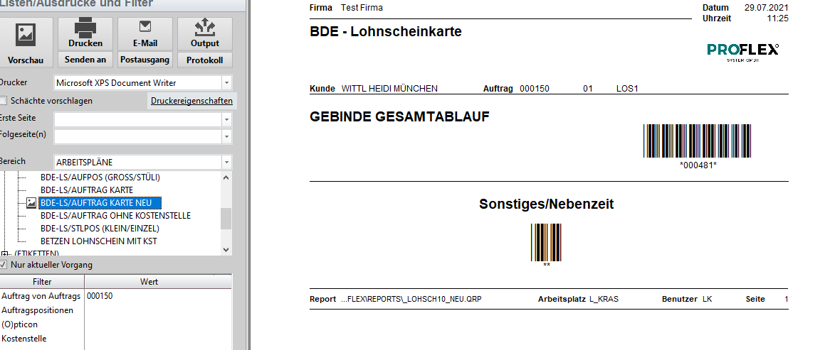 6. AUFTRAGSLOHNSCHEINE aufklappen und den Report: BDE-LS/AUFTRAG KARTE drucken