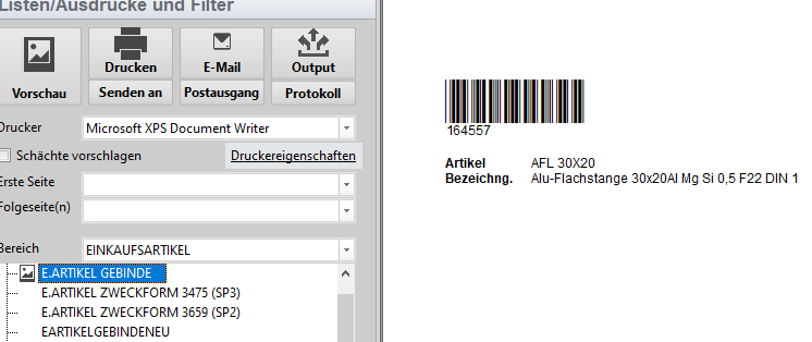 Druckvorschau - Artikel auswählen und den Report: E.ARTIKEL GEBINDE druckem
