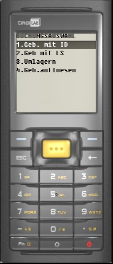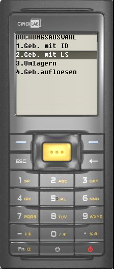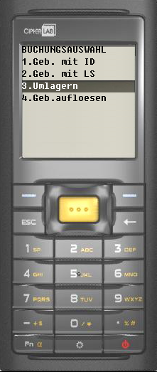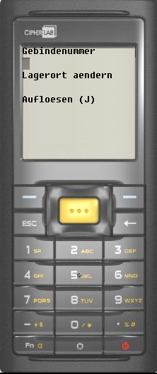 3. Entweder einen neuen Lagerort eingeben (Lagerortnummer) oder die Zeile überspringen und ein J eingeben um das Gebinde aufzulösen. Buchstaben werden über die Taste Fn aktiviert. | ![]() |