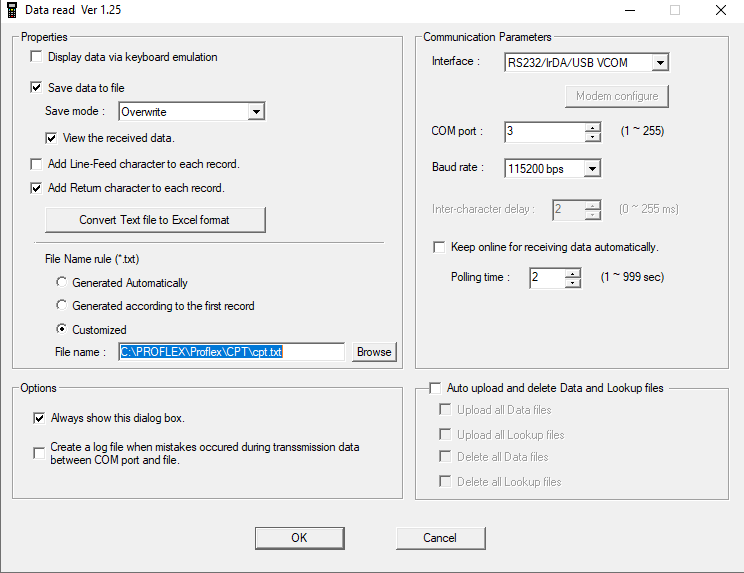 COM port und File name können sich unterscheiden. Nach dem Abrufen befinden sich die Dateien in dem angegebenen Verzeichnis und werden dann von PROFLEX bearbeitet. Danach werden die Daten automatisch in einen Archiv Ordner abgelegt den PROFLEX selber anlegt.