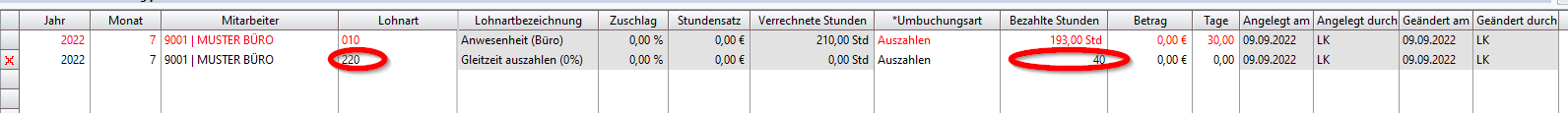 Nach der Abrechnung wird eine manuelle Zeile angelegt, in der die Lohnart für die Auszahlung der Gleitzeitstunden ausgewählt wird. Die Standardlohnart hierfür ist die 220.