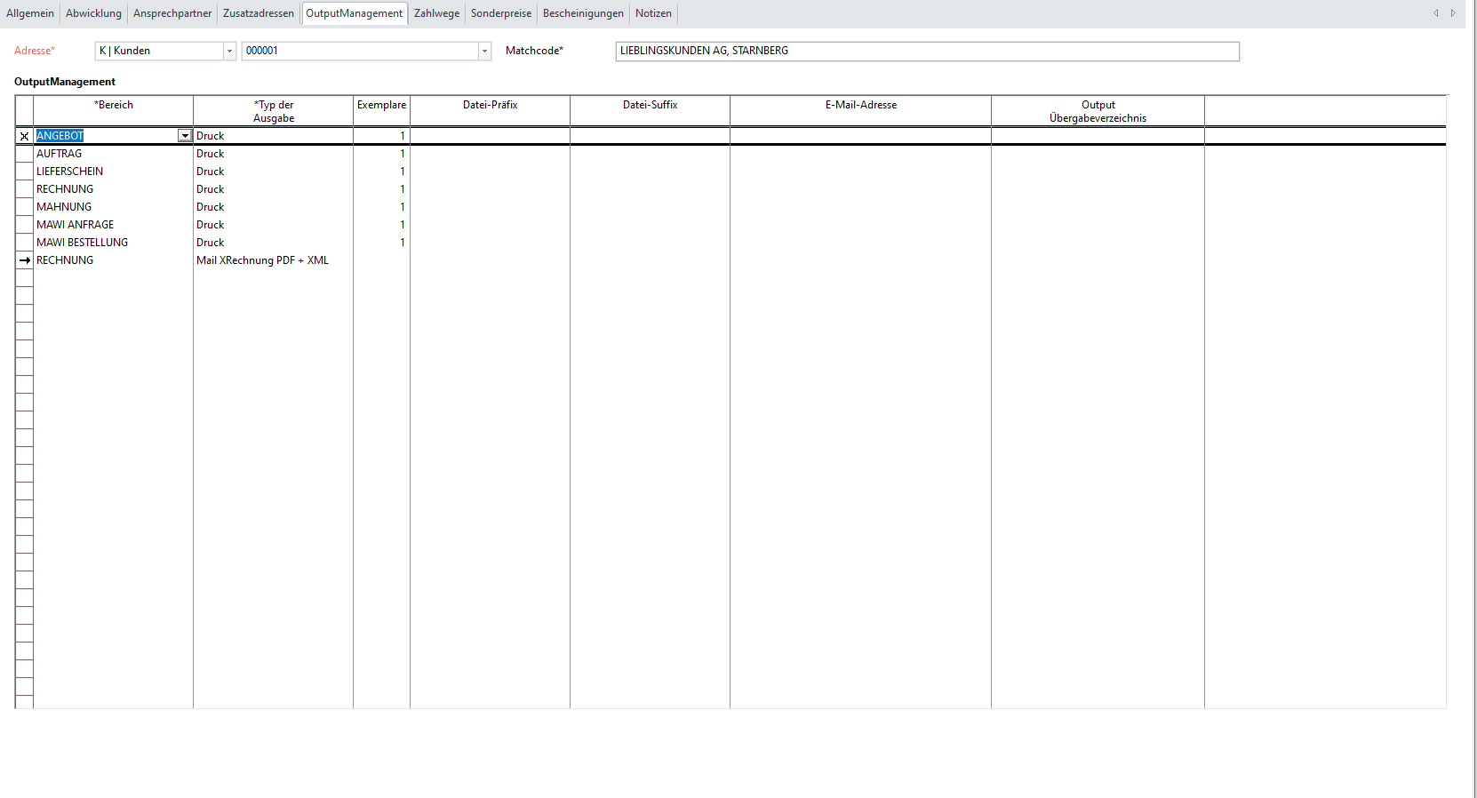 In dieser Maske kann man die Art der Belegausgabe unter Outputmanager steuern.