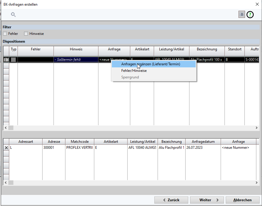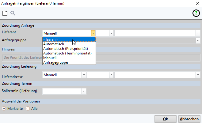 Anfrage ergänzen (Liefernat/Termin)ausgewählt werden