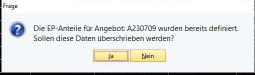 Wenn in der GAEB-Datei die EP-Anteile durch den Ausschreiber vorgegeben sind, müssen in dem Dialog die EP Kostenanteile angegeben werden. Stimmen diese nicht mit der Liste aus den Firmengrundeinstellungen überein, kommt eine Abfrage während des Imports einer GAEB-Datei:
