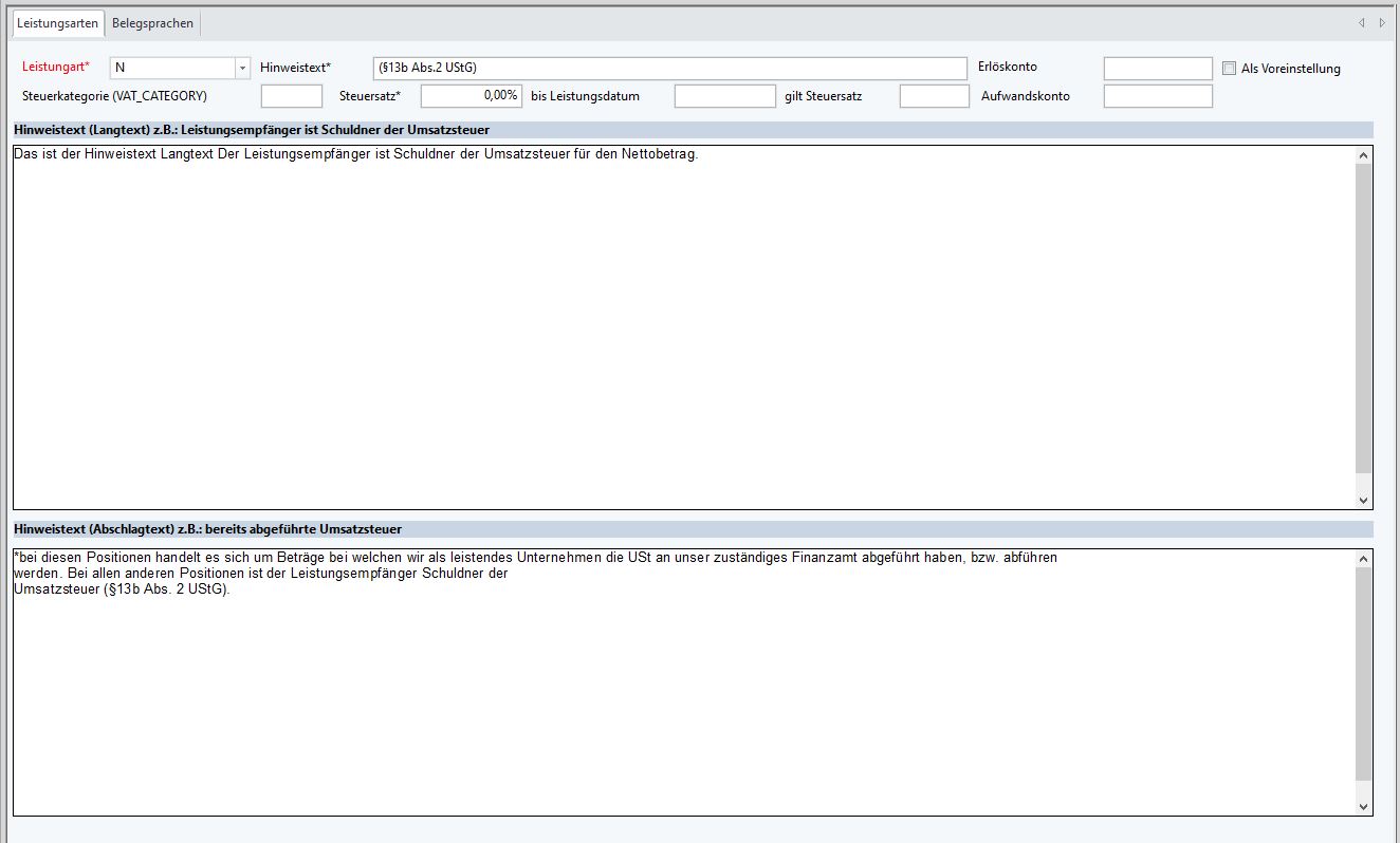 Als Hinweistext wird eine Kurzbezeichnung der Leistungsart vergeben. Weiters muss noch der Steuersatz befüllt werden, der für diese Leistungsart zutreffend ist.