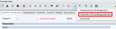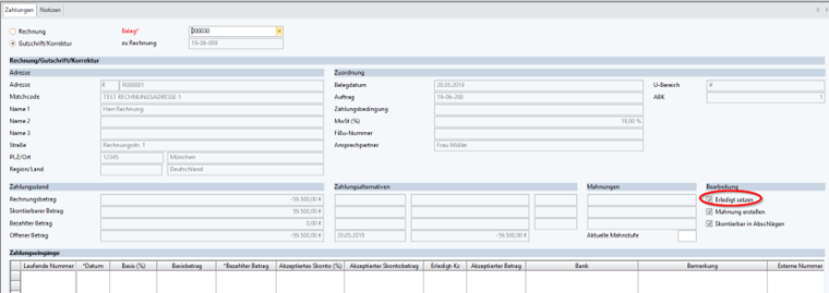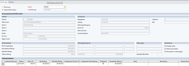 Die Gutschrift wird erstellt, jedoch nicht in der OP-Verwaltung ausgebucht, sondern nur auf „Erledigt“ gesetzt; es wird auch keine Zahlung zur vorangegangenen Abschlagsrechnung eingegeben.