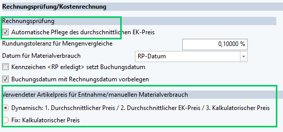- Verwendeter Artikelpreis für Entnahme/manuellem Materialverbrauch: Dynamisch oder Fix