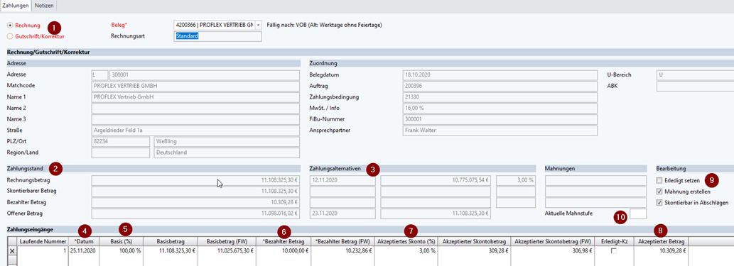 3 | Information zum Zahlungsziel und dem Skonto. Erfassungstabelle der Zahlungen. Es können beliebig viele Zahlungen angegeben werden. |