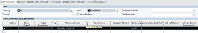 <Kennung/Bauteil> Benennung der Stückliste. Nach der Kennung/Benennung kann man suchen. Auf allen Ausdrucken wird diese angedruckt