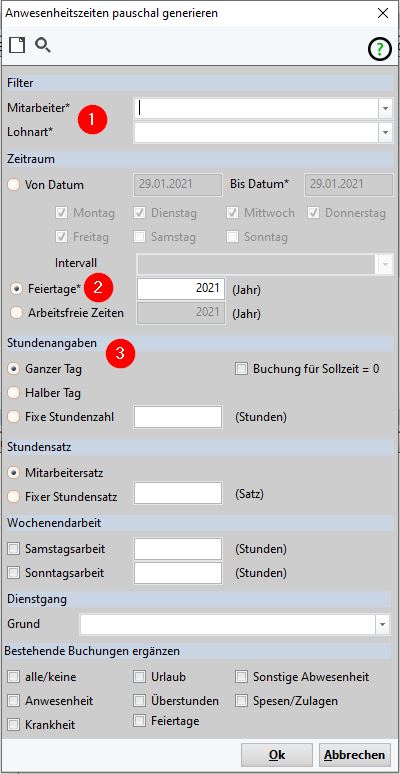 Mittels diese Funktion können die bereits angelegten Feiertage bei einem oder mehreren Mitarbeitern in den Anwesenheitszeiten eingetragen werden.