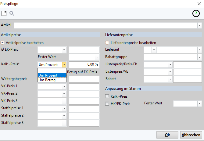 Ek-Preis: Auswahl Fest auf | Um Prozent | um Betrag - Eingabe des Wertes