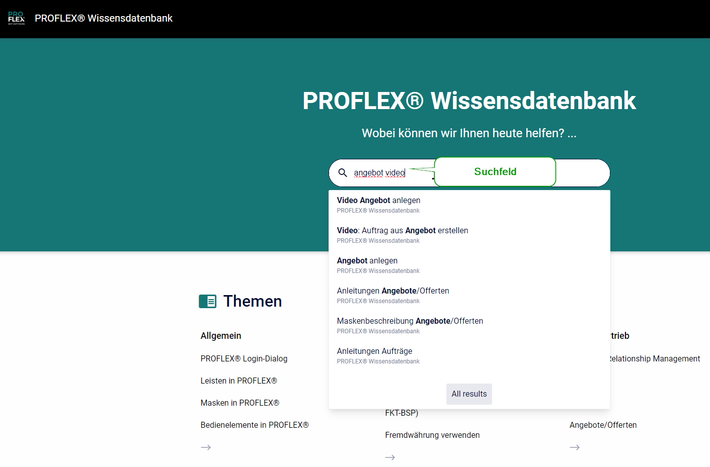 Eingaben im Suchfeld zeigen alle verfügbaren Artikel zu dem eingegebenen Suchbegriff an.
