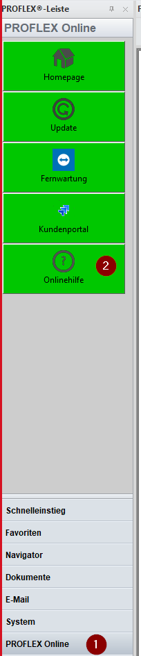 Die Onlinehilfe von PROFLEX kann in der PROFLEX-Leiste (1) mit dem Button Onlinehilfe(2) aufgerufen werden.