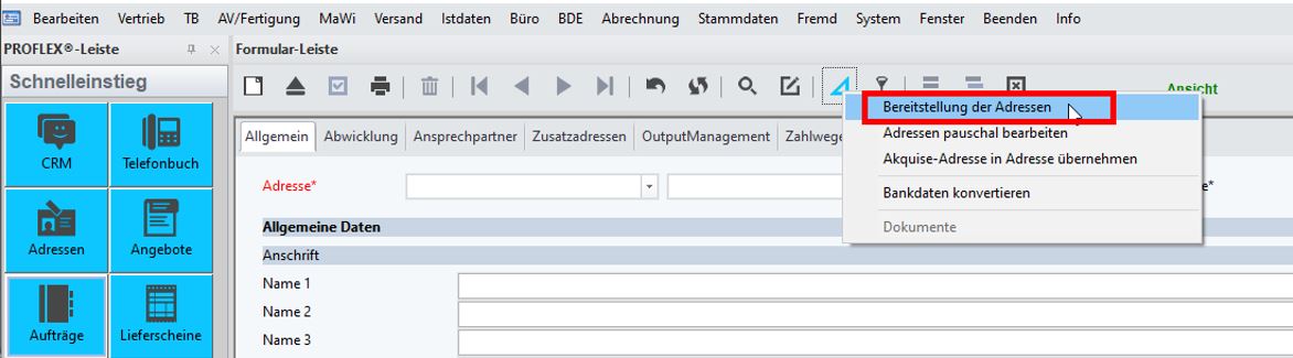 Dazu geht man in das Menü <Vertrieb/Adressen/Adressen> und klickt auf das blaue Dreieck um zu den Werkzeugen zu gelangen. Hier wählt man sich die Option „Bereitstellung von Adressen“ aus.