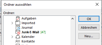 Bei Übergabeoption Outlook wird ein Dialog mit der Auswahl der Outlookordner angezeigt. Hier ist der Ordner auszuwählen in welchen die Adressen geschrieben werden sollen.