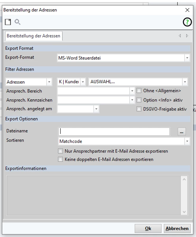 Wenn alle vorhandenen Ansprechpartner von Adressen exportiert werden sollen, leert man das Feld Anschprech. Bereich.