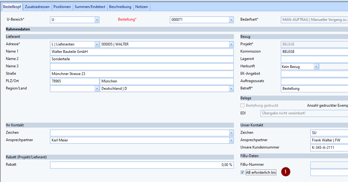 Wenn im Bestellkopf das Feld AB erforderlich bis aktiviert ist, muss ein Datum angegeben werden.