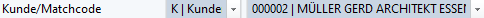 Nun kann man mit TAB, Enter oder Mausklick aus dem Feld springen und PROFLEX® wählt automatisch den Kunden mit der Nummer 00002, da nur ein Adresssatz, der mit Mü beginnt in der Datenbank ist: