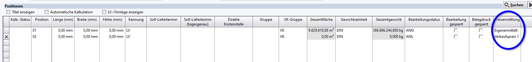 Im Angebot auf der Positionsebene kann für jede Position die Preisermittlung eingestellt werden.