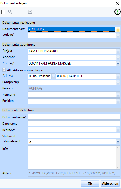 Vorlage | Bei Neuanlage aus einer Vorlagendatei kann diese hier gewählt werden | im Dokumentenartenstamm werden die Vorlagen angegeben |