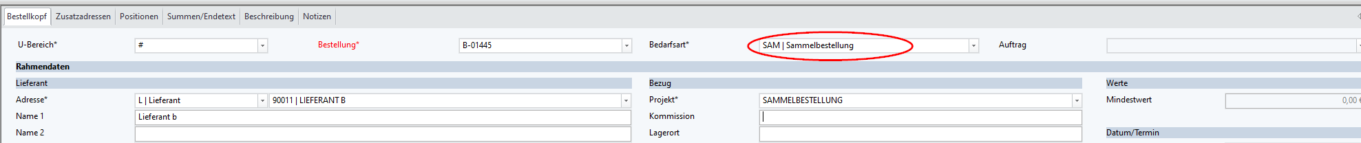 Bereits im Bestellkopf muss die Bedarfsart für eine auftragsübergreifende Bestellung oder Sammelbestellung angegeben sein.