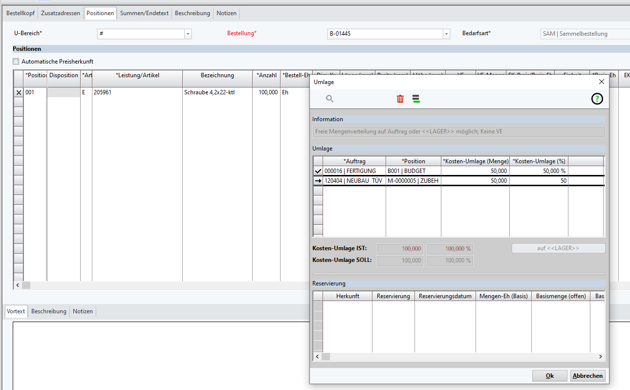EK-Bestellung: Umlage einer Position auf mehrere Aufträge