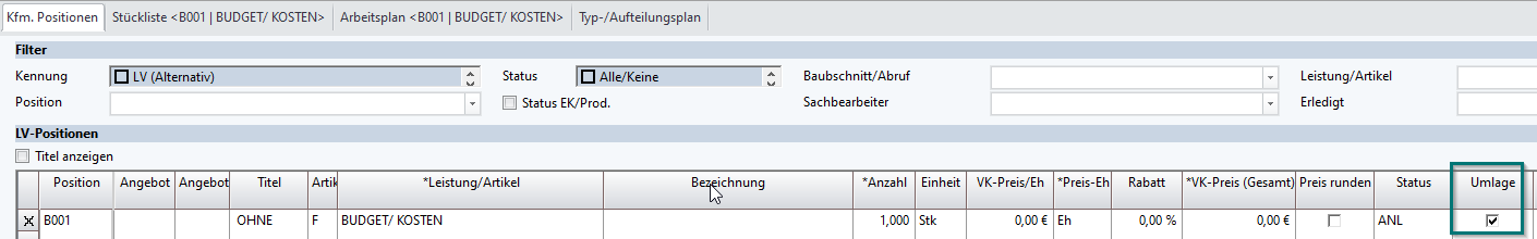 Im Auftrag muss mindesten bei einer Auftragsposition die Option Umlage aktiviert sein.