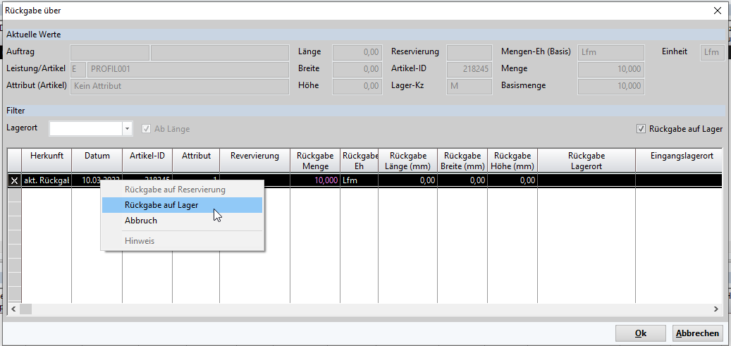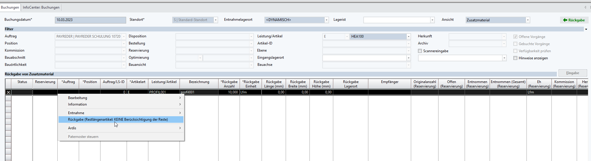 Rückgabe (Restlängenartikel: KEINE Berücksichtigung der Reste)benutzt werden um die Mengen an das Lagerkonto zurückzugeben.