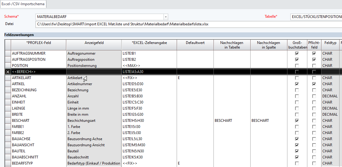 Im Anhang befindet sich eine Excelvorlage und die Daten für das Schema MATERIALISTE HT/ET und MATERIALLISTE POSITION