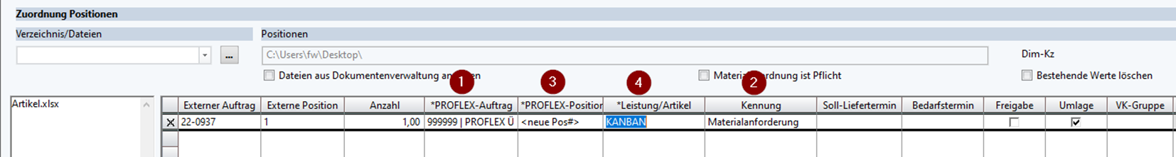 Beim Materialimport können keine zwei Schemas angelegt werden um im 1.Schritt eine Materialtopfposition anzulegen. Die Anlage als Materialtopf mit autom. Nummernvergabe (M-00001,2,2…) würde zwar funktionieren (Auftragsposition =MAX), das Importschema für die Materialliste kann sich aber nicht auf die zuvor angelegte Position beziehen.
