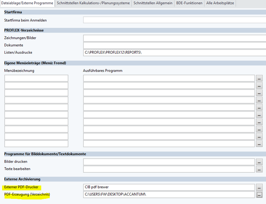 Dazu zuerst in den Arbeitsplatzeinstellungen unter Dateiablage/Externe Programme unter externe Archivierung entsprechende Einträge vornehmen. Sie benötigen dazu eine pdf Drucker