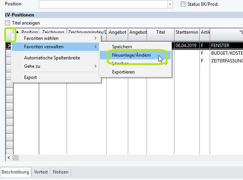 Über die linke Maustaste auf die erste, leere Spalte in jeder Tabelle kommt man zu der Funktion Favoriten verwalten – Neuanlage/Ändern.