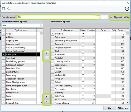 Sind die Spalten fertig eingestellt muss ein Favoritenname vergeben werden, erst dann kann durch <Ok> gespeichert werden.