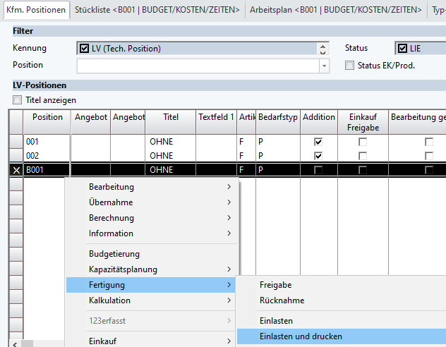 Auftrag öffnen, Position(en) kfm oder technische auswählen und rechte Maustaste.