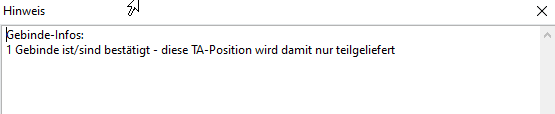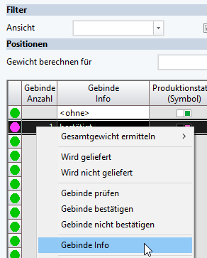 Nach dem die Funktion Gebinde Info kann der Status abgefragt werden.