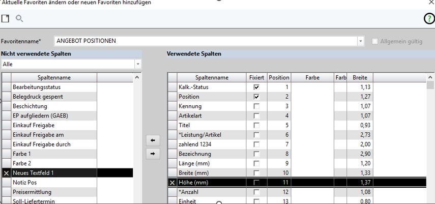 In die Positionstabelle klicken und die Funktion <Favoriten bearbeiten> aufrufen