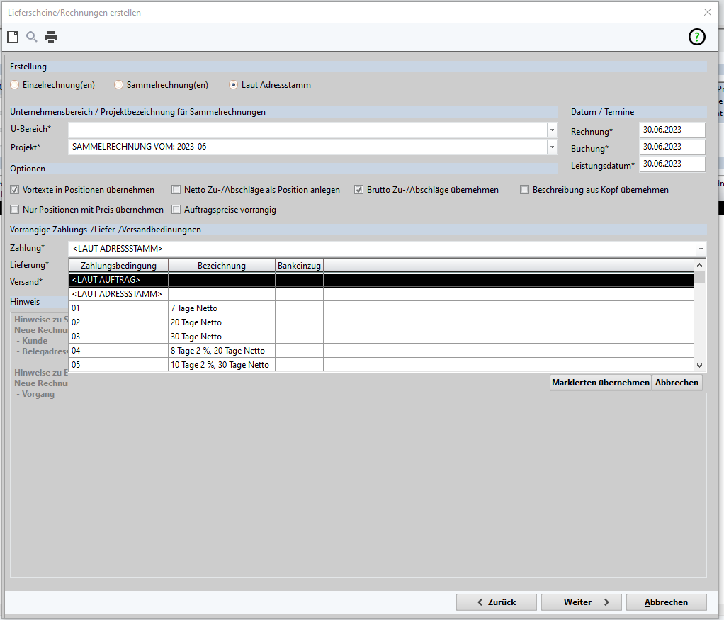 Hier gibt es die Option die Zahlungsbedingung LAUT ADRESSSTAM, LAUT AUFTRAG oder eine andere Zahlungsbedingung aus den Stammdaten auszuwählen. Je nach Auswahl wird dann die jeweilige Zahlungsbedingung in die Rechnung übernommen.