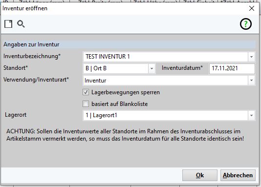 Es wird für jeden Lagerort eine Inventur eröffnet. Wichtig ist, dass der Standort und das Inventurdatum bei den verschiedenen Inventuren gleich ist. Zusätzlich wird der jeweilige Lagerort ausgewählt.