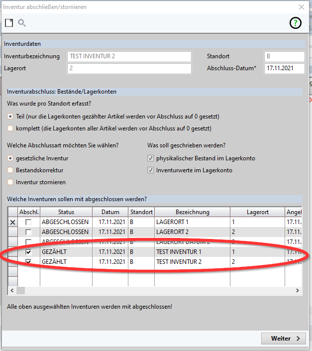 Sind die Artikel in den Inventurlisten eingetragen und die Option Inventur komplett gezählt ist gesetzt, kann die Inventur abgeschlossen werden.