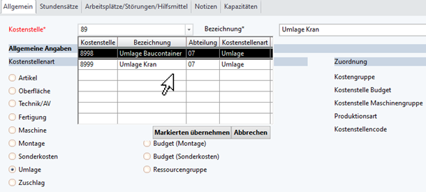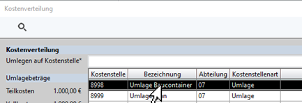 In dem Dialog auswählen, auf welche Kostenstelle die Umlage erfolgen soll.