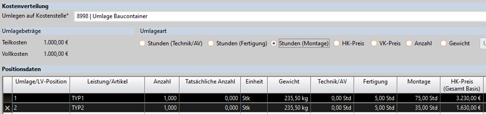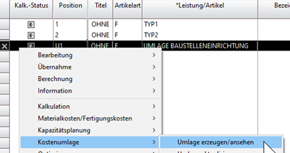 Die Position nach dem Kalkulieren markieren und mit der rechten Maustaste die Funktion <Kostenumlage> aufrufen