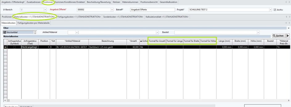 Bei den Angeboten/Aufträgen sind unter dem Reiter Positionen/kfm. Positionen in der Tabelle Materialkosten Spalten für Formel für Anzahl, Formel für Länge, Formel für Breite und Formel für Höhe vorhanden