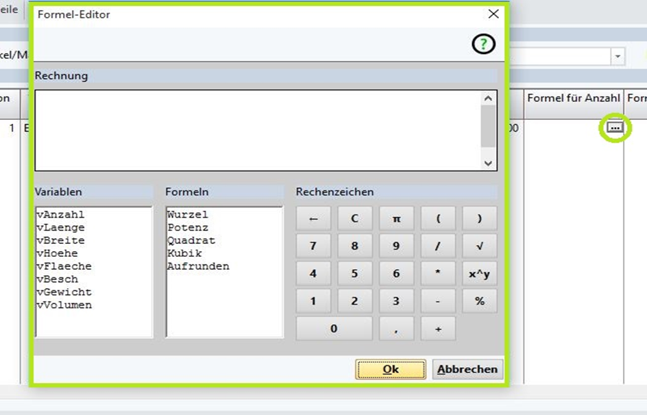 Mit den Formeln können in der Materialkalkulation und dem Arbeitsplan die Werte für Anzahl, Länge, Breite und Höhe anhand der Werte Anzahl, Länge, Breite und Höhe aus der Angebots-/Auftragsposition verwendet werden.