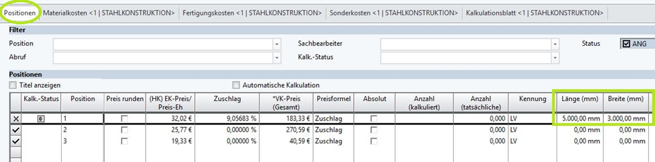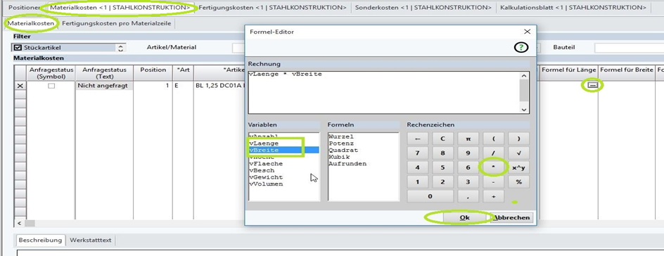 Die Länge für das Material in den Materialkosten soll aus der Länge und Breite aus der Angebot-/Auftragspositionen berechnet werden.