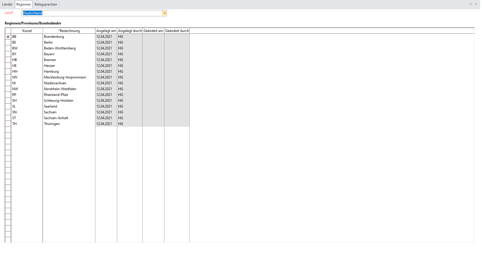 In dieser Maske können Regionen/Provinzen/Bundesländer für ein bestimmtes Land angelegt werden.
