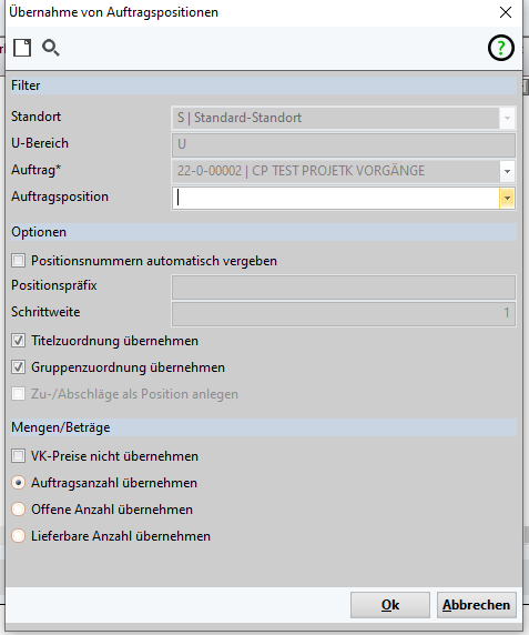 | Übernahme von Auftragspositionen Auswahl der Auftragspositionen Option: Positionsnummer neu nummerieren. Hinweis: Wird immer mit 3-Stellen übernommen (001,002…) Optional: Positionspräfix L-001 Optional: Schrittweite 1=001, 10=010