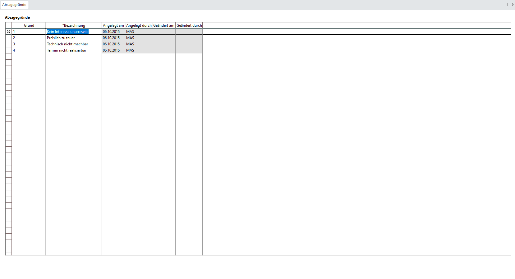 In dieser Maske werden die Absagegründe für das Angebot angelegt.
