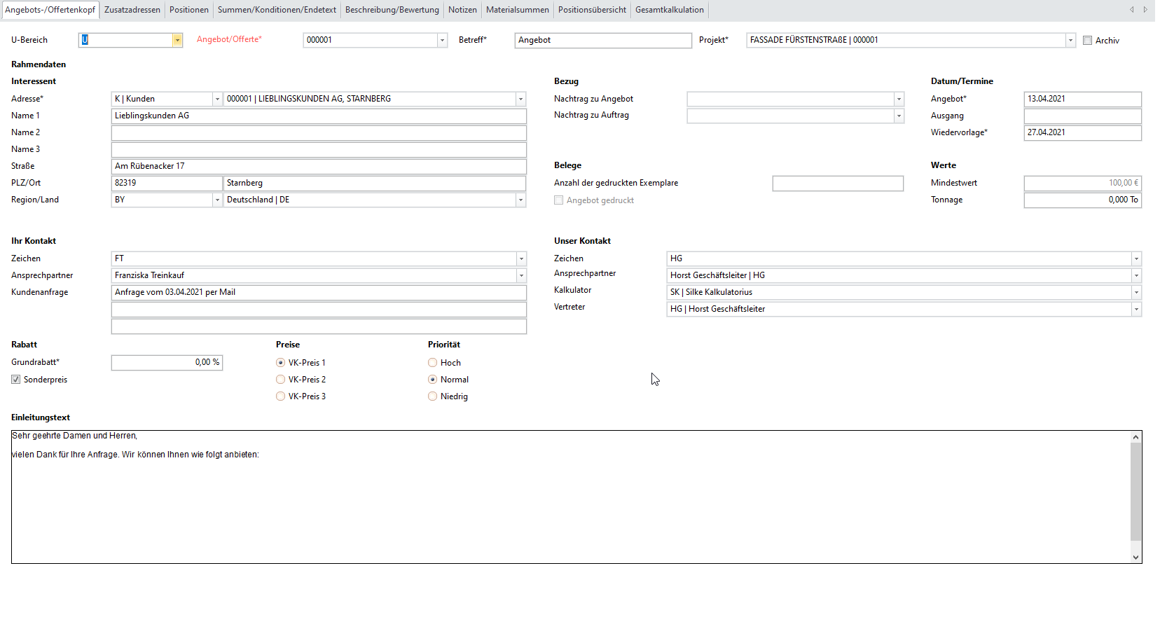 Dies ist der Angebotskopf. Er enthält neben den Kontaktdaten des Interessenten auch die eigenen Ansprechpartner, den Einleitungstext und eventuelle Verknüpfungen zu anderen Angeboten oder Aufträgen.
