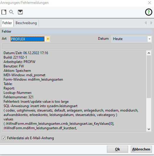Fehlerdetails als E-Mail-Anhang | Wenn aktiviert wird der Fehler als Anlage in der E-Mail versendet | |