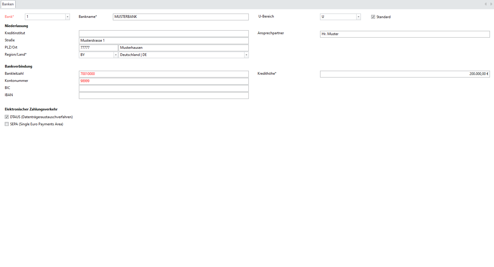 Standard | Aktivieren, wenn eine der angelegten Banken standardmäßig hinterlegt werden soll | |